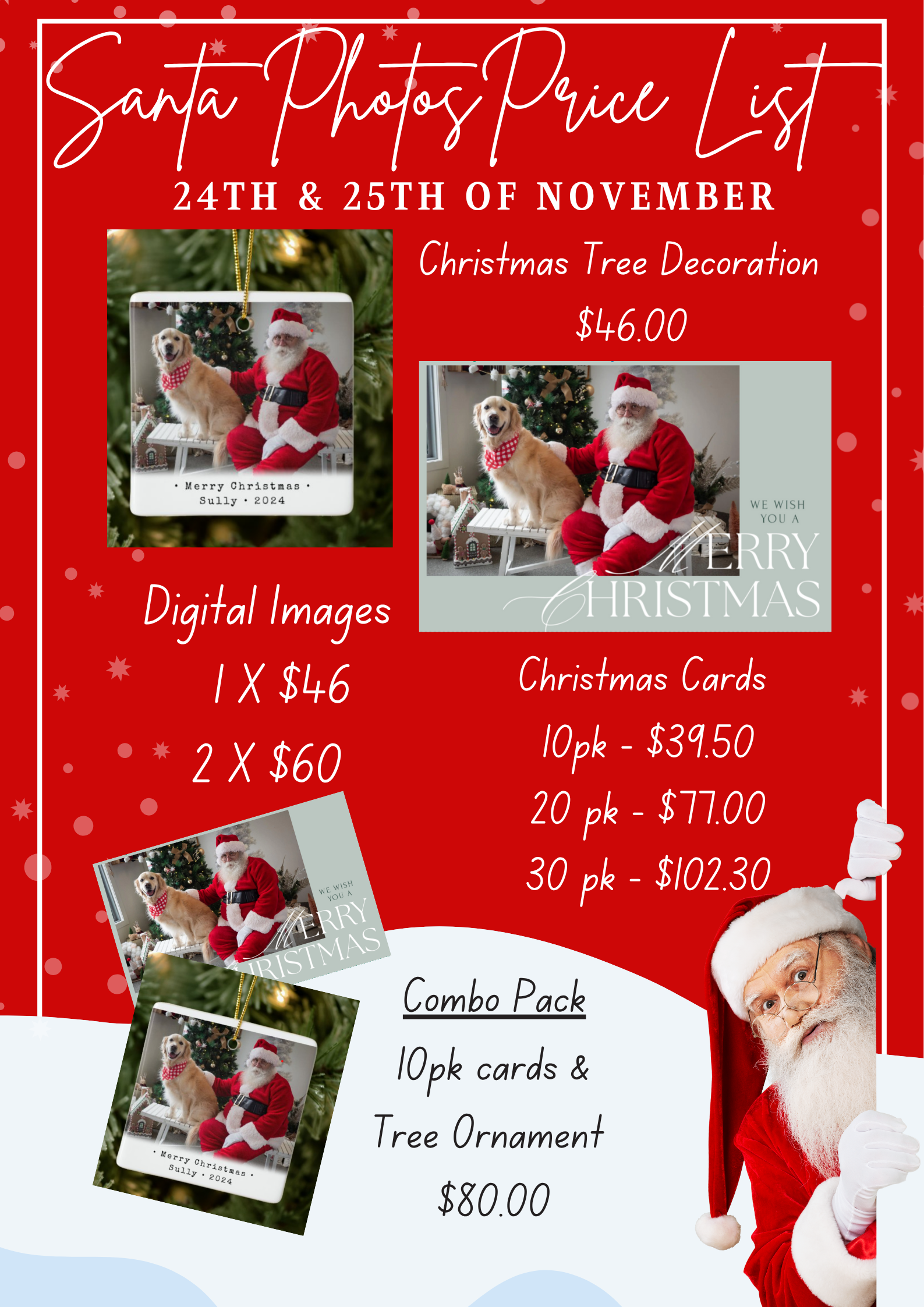 Our Santa Paws sessions have filled quickly in previous years, so we encourage you to reserve your spot today with prepayment of your Christmas Keepsakes (Price List below) by calling us at the clinic on 03 5976 4244 or emailing us at contact@beleuravet.com.au.